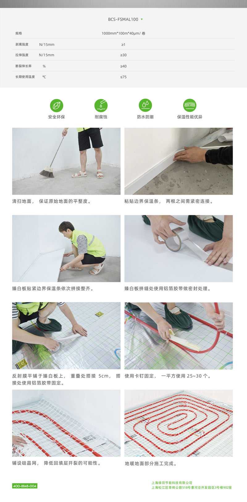 綠羽臻鋁膜具有防水、防止混凝土侵蝕保溫板的作用。反射膜上的網格為施工人員設計盤管路線、確定地暖管間距提供便利和依據,讓地暖管盤管過程更加標準化。