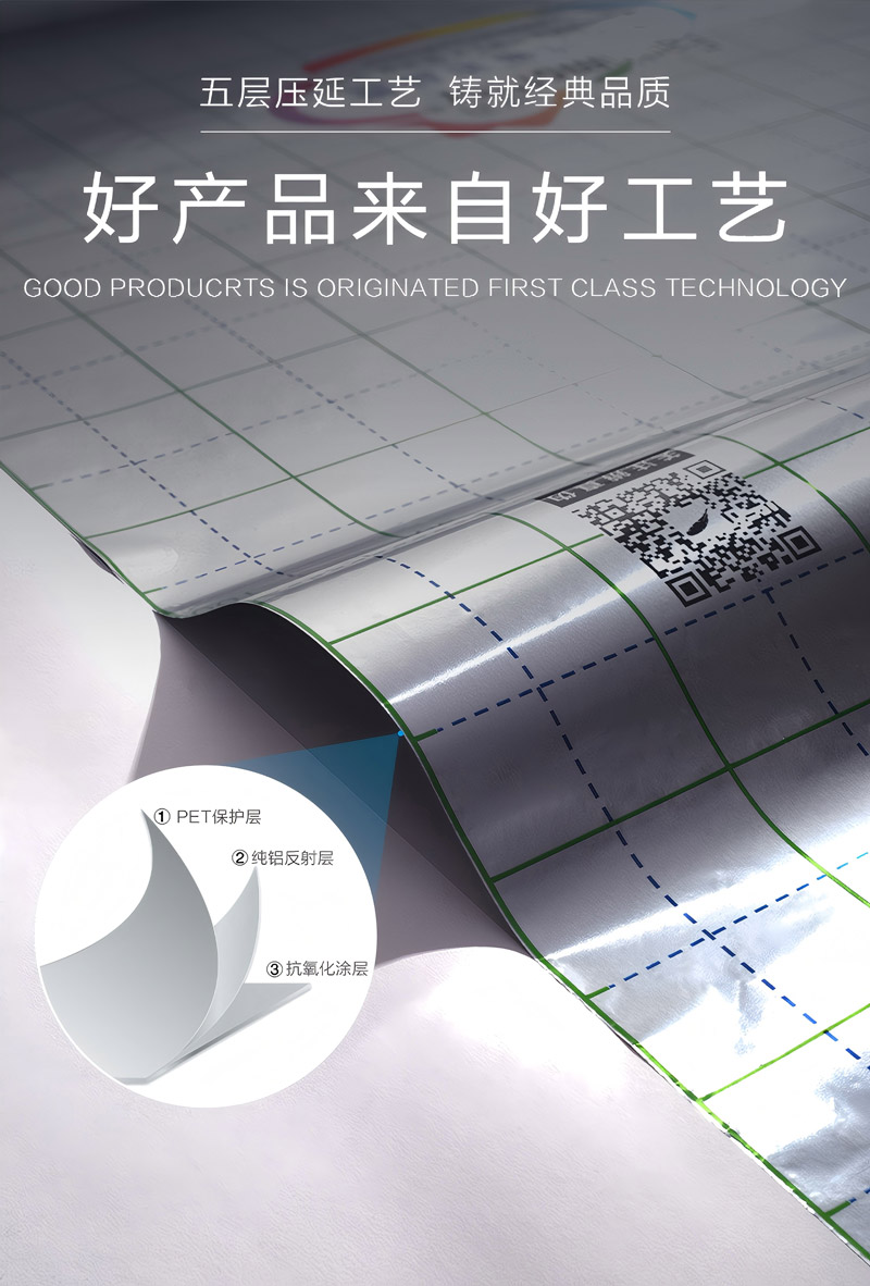 綠羽純鋁鉑晶膜由高強度PET膜和抗氧化涂層復合而成,鋁層厚度達7μm,可有效隔絕氧氣和水份,具有均熱、防水、防止混凝土侵蝕保溫板的作用。鉑晶膜上的網格為施工人員設計盤管路線、確定地暖管間距提供便利和依據,讓地暖管盤管過程更加標準化。